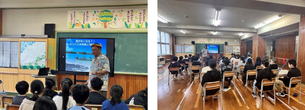 日本キリバス協会のケンタロ・オノ氏による講演では、クイズ形式やキリバス語のじゃんけんを取り入れながら、キリバス共和国の歴史や文化、衣食住に関する基礎的な理解を深めました。あわせて、気候変動が温暖化を通じて衣食住などの身近な生活に影響を及ぼすことが示され、児童が課題を自分事として捉えるきっかけとなりました。